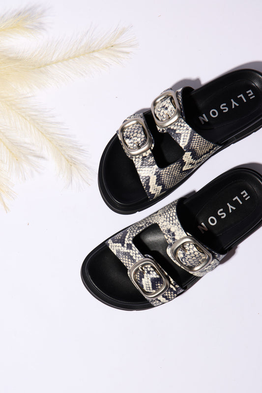 Designed to turn heads, the DUNES slide features buckle hardware and snakeskin leather. Effortlessly refined, this standout style is destined to become your go-to summer favourite.