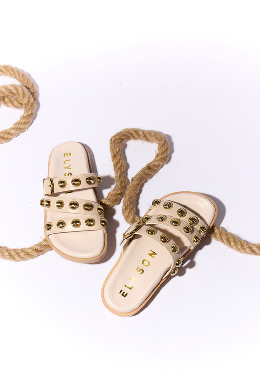 Make a statement with the SHELLS slide. Featuring multiple straps adorned with bold hardware and set on a molded footbed, this design offers all-day comfort while elevating any look.