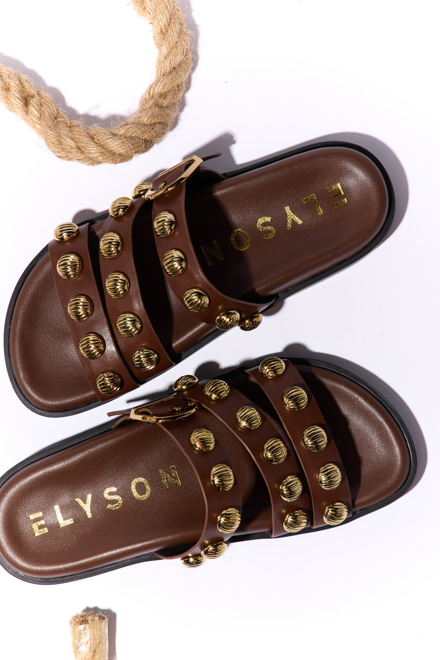 Make a statement with the SHELLS slide. Featuring multiple straps adorned with bold hardware and set on a molded footbed, this design offers all-day comfort while elevating any look.