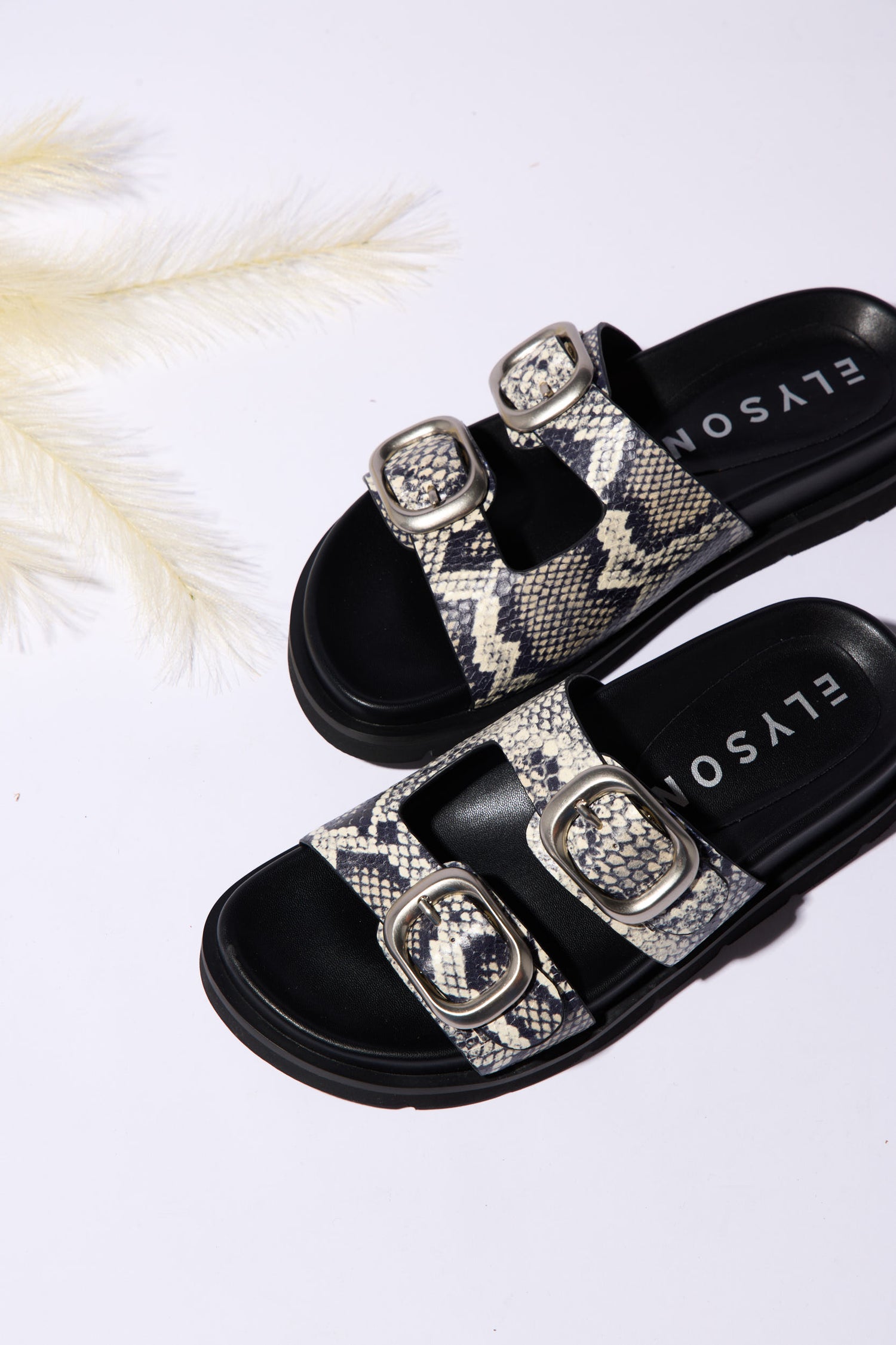 Designed to turn heads, the DUNES slide features buckle hardware and snakeskin leather. Effortlessly refined, this standout style is destined to become your go-to summer favourite.